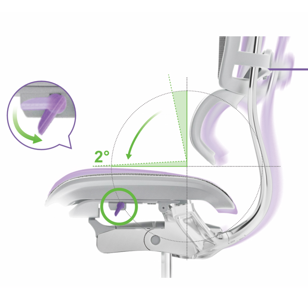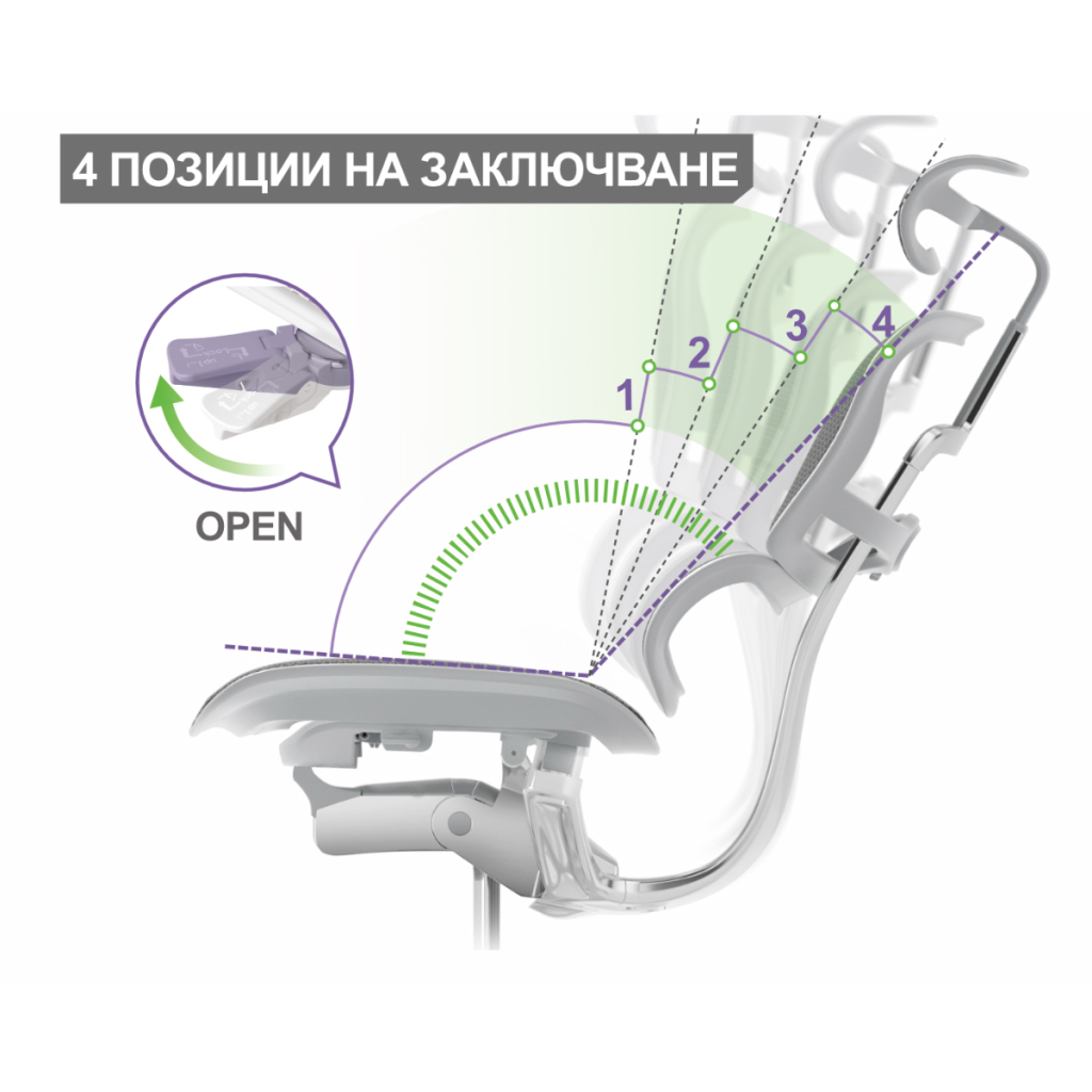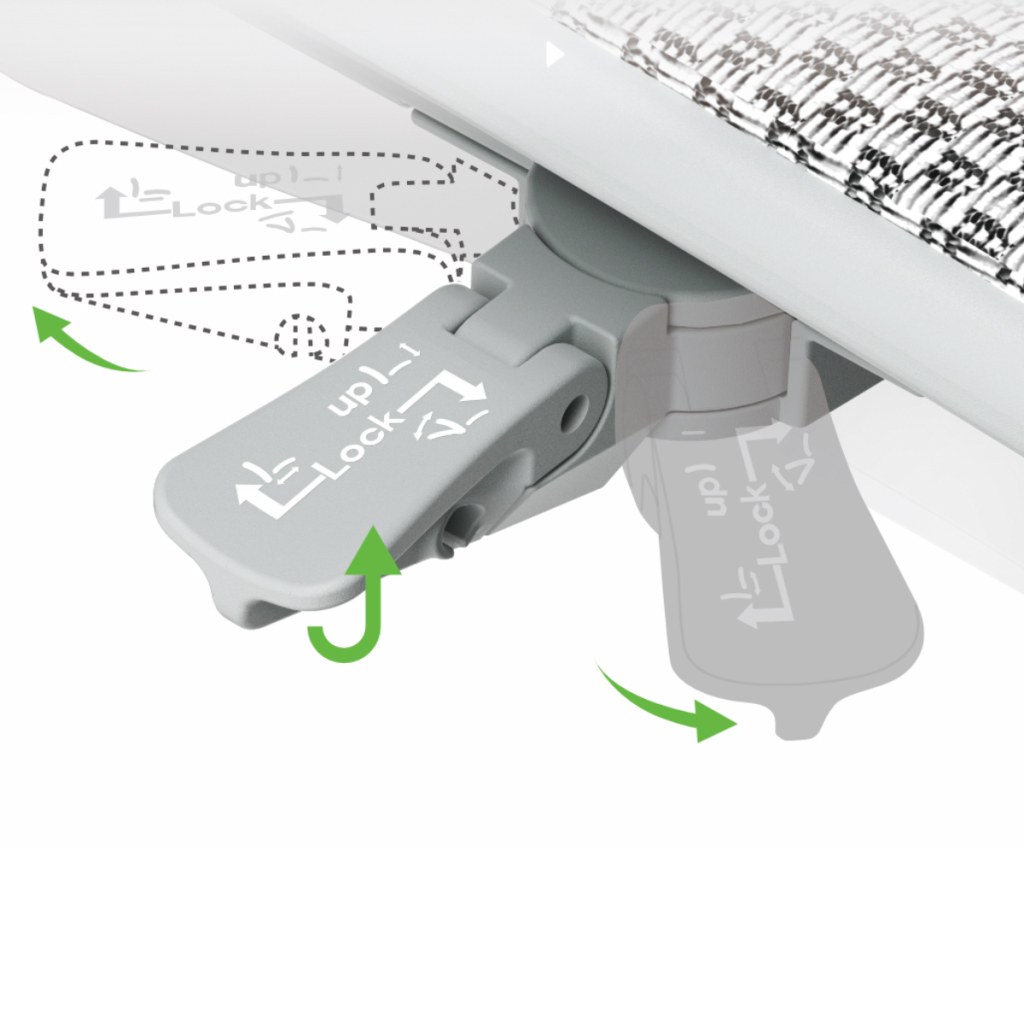 Височината на седалката се регулира плавно чрез газов амортисьор, а синхронният механизъм позволява настройка на наклона на облегалката и заключване в четири позиции. Благодарение на Anti-Shock функцията, седящият е защитен при преминаване между различните позиции. Силата на люлеене може да се регулира според индивидуалното тегло.