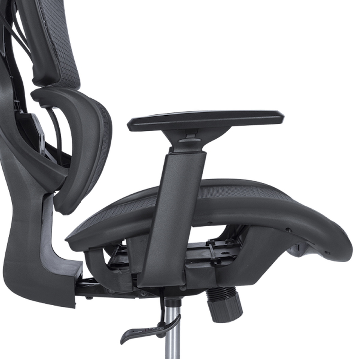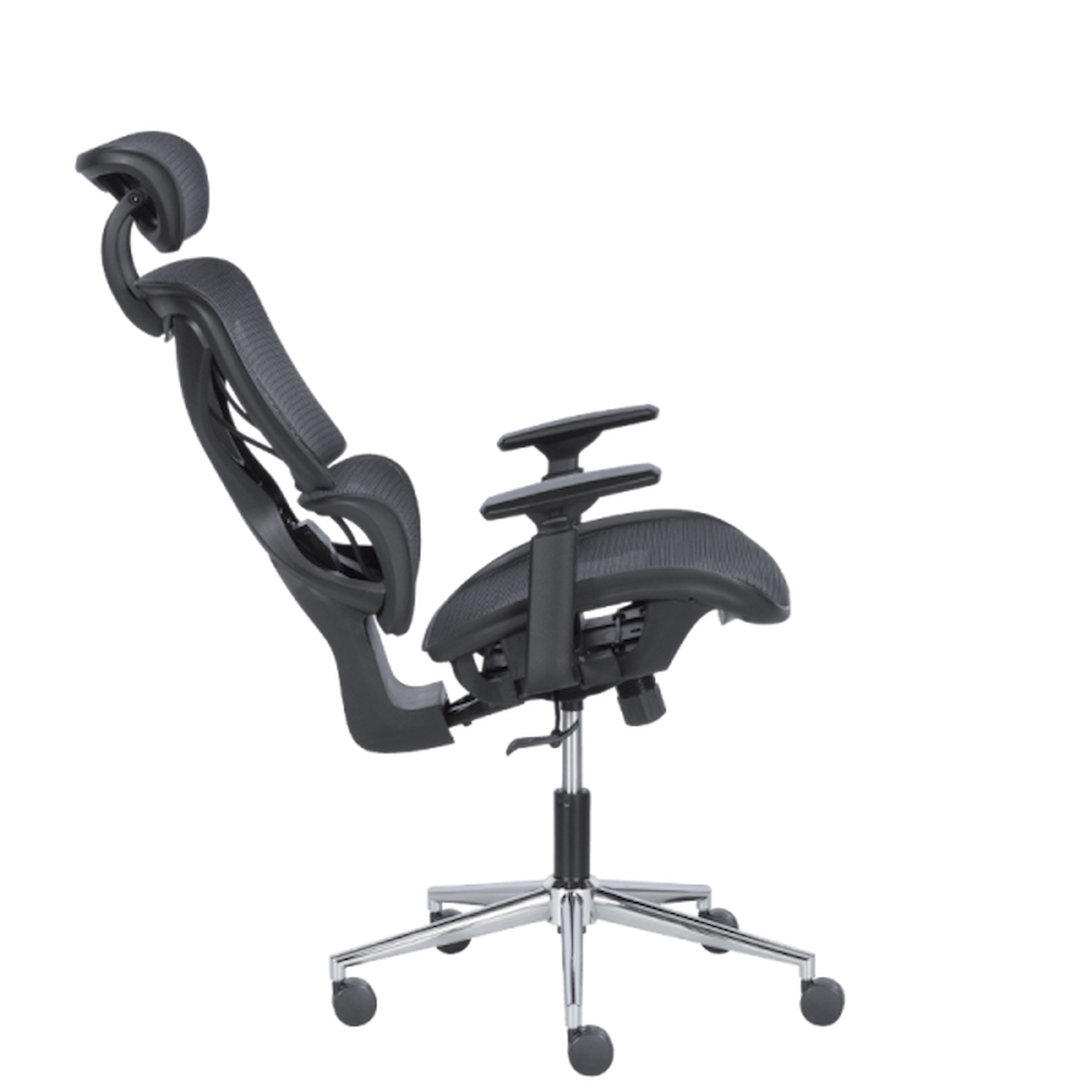 Синхронният механизъм позволява едновременно движение на седалката и облегалката, с възможност за заключване в избрана позиция. 2D подглавникът се регулира по височина и ъгъл, за да осигури допълнителна опора на врата и главата.