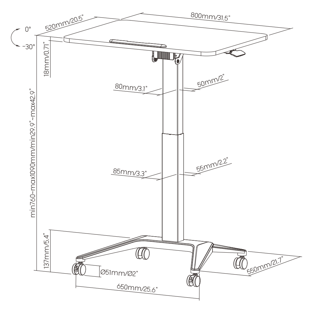 • Размери (ШхДхВ): 800 x 557 x 760–1090 мм