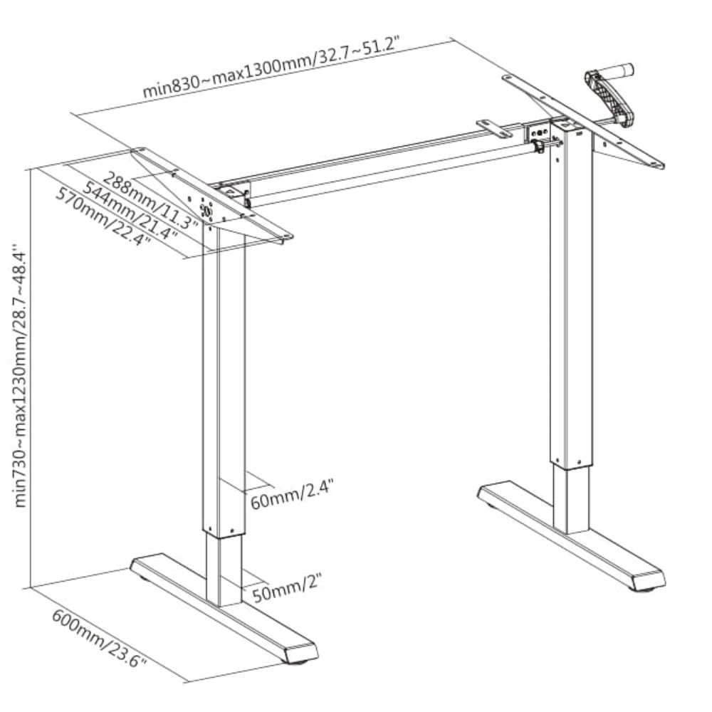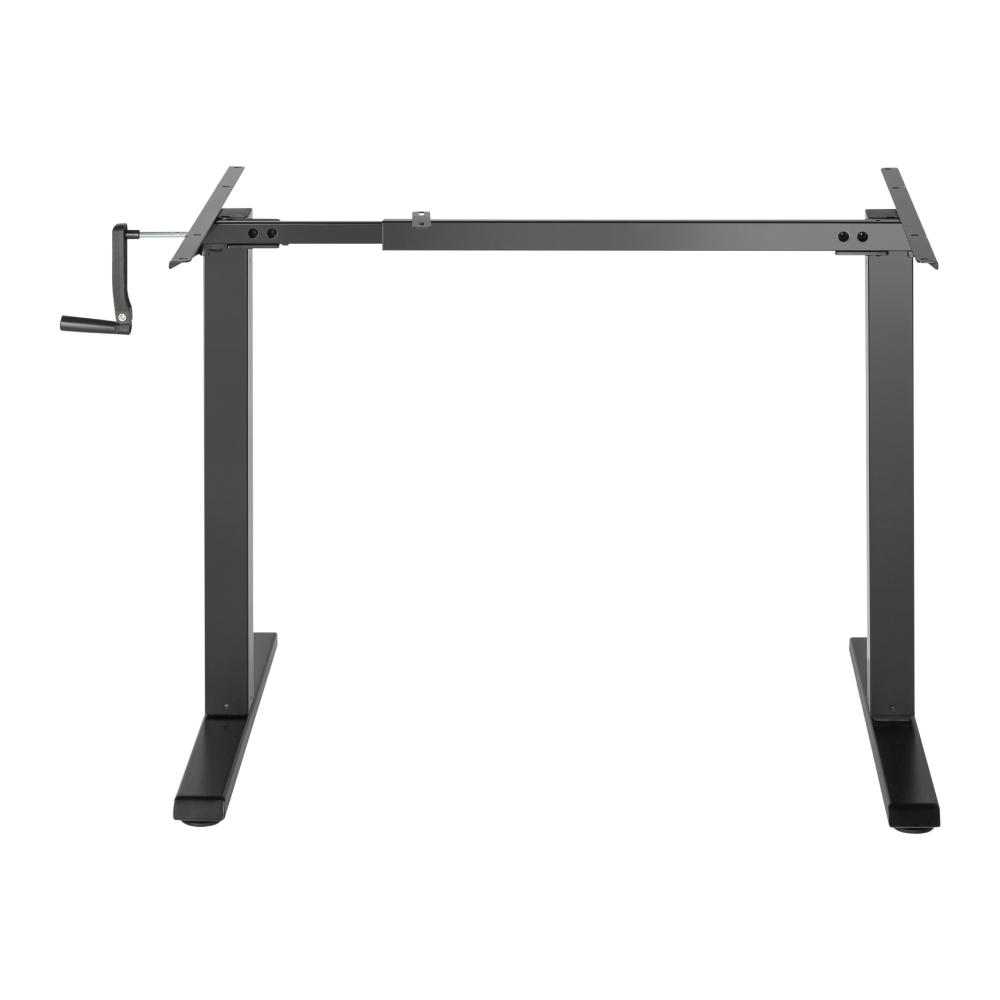 С възможност за регулиране на височината (730–1230 мм) и ширината (830–1300 мм), бюрото се адаптира към различни потребности и пространства. Сгъваемата манивела осигурява плавно и лесно регулиране, а регулируемите крака поддържат стабилност дори върху неравни повърхности.