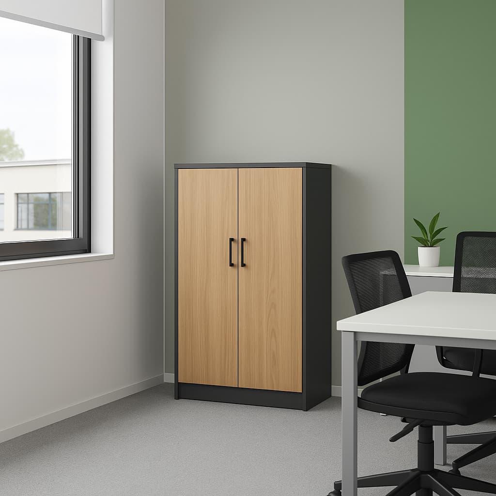 • Офис шкаф с четири рафта и врати V4 , осигуряващи достатъчно пространство за папки, документи, книги и офис консумативи.