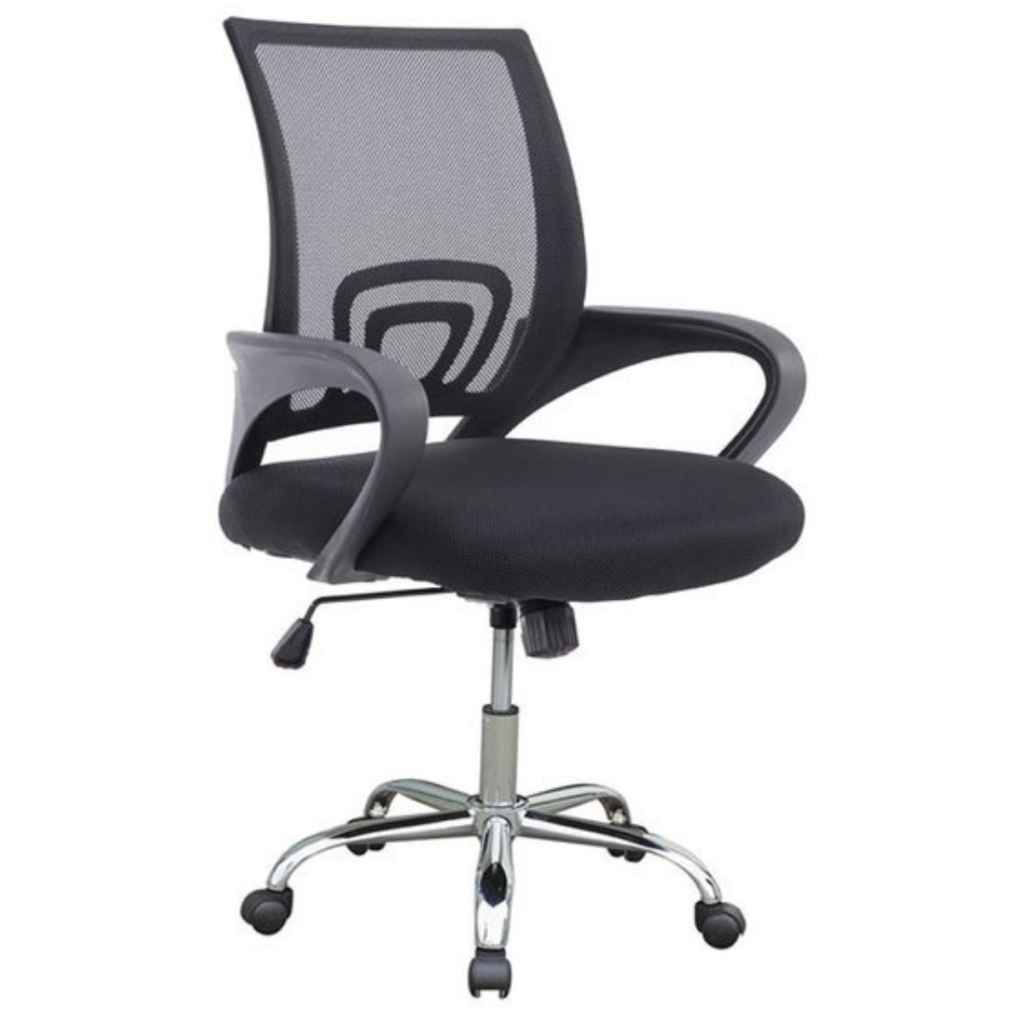 Lori Black Chrome – работен офис стол с хромирана основа, мрежеста облегалка и TILT механизъм. Комфорт и стил с товароносимост до 110 кг.