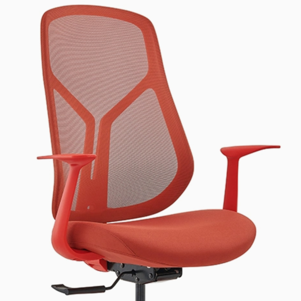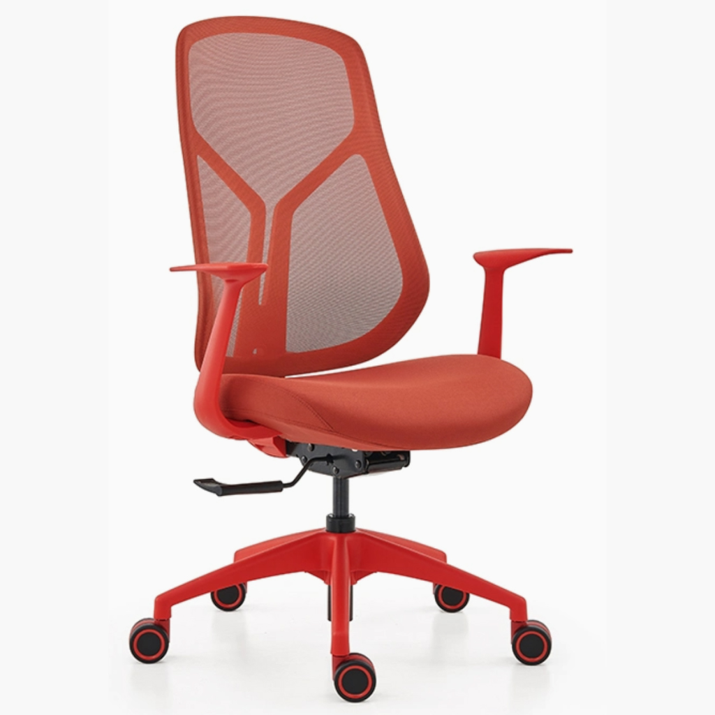 Столът разполага с фиксирани подлакътници, ергономична седалка, тапицирана в червена дамаска, и мрежеста облегалка в същия цвят, които осигуряват комфорт и добра вентилация.