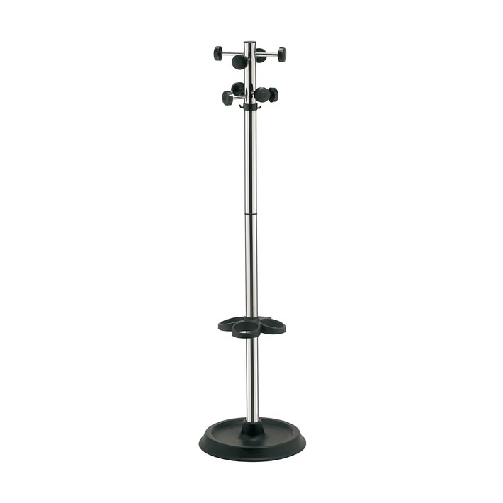 Закачалка с метална конструкция с хромирано покритие или прахово боядисана в черен цвят.Изчистени и елегантни форми.Декоративни пластмасови елементи.Поставка и отцедник за чадъри.Височина: 173 cm.